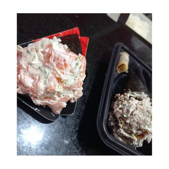 Recheio de salmão grelhado cm cream cheese, por cima cream cheese e couvi frito