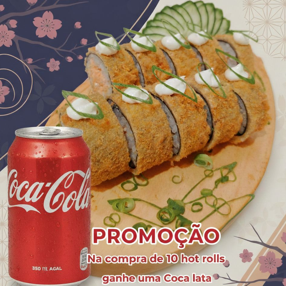 10 hot hol de salmão grelhado mais uma coca lata de 350ml. Acompanha 2 saches de soyu, 1 de tarê e 1 par de hachi