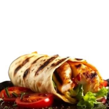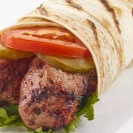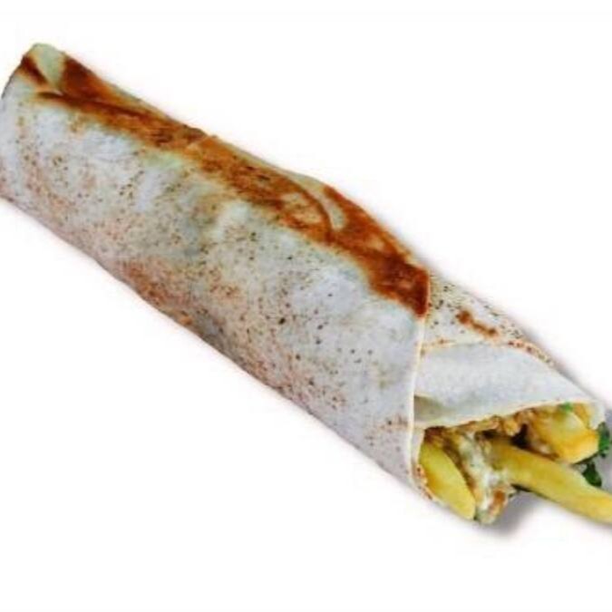 Tiras de frango grelhado (na maquinade churrasco grego) , no pão sírio , molho de alho casero , batata frita , alface, picles , finalizada com Molho de Romã