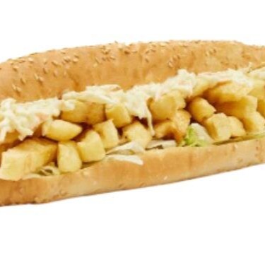 Batata frita maionese com legumes, tomate, alface، picles, hortelã,pimentão , finalizada com molho de Romã