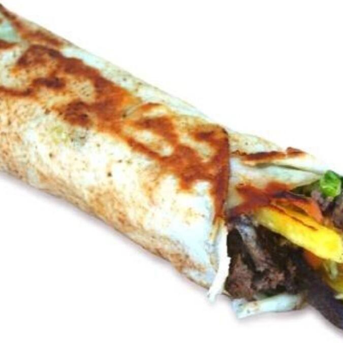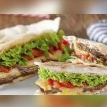 Tiras de carne na máquina de churrasco grego,2 folhas de paes sirio : molho tahine ,alface, tomate,cebola,salsa,queijo mussarela, finalizada com molho Romã e orégano