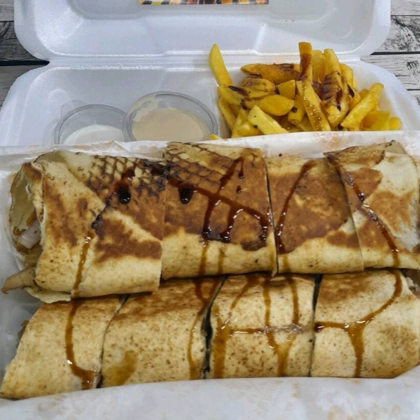 Carne e frango grelhados na churrasqueira, no pão síria , molhao de tahine, creme de alho , tomate , alface , cebola , salsa hortelã, batata frita , finalizada com molho de Romã