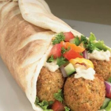 Bolinho de grão de bico (frito) , molho de Tahine ,alface,tomate,salsa,picles de pepino,hortelã,no pão sirio ou paguete
