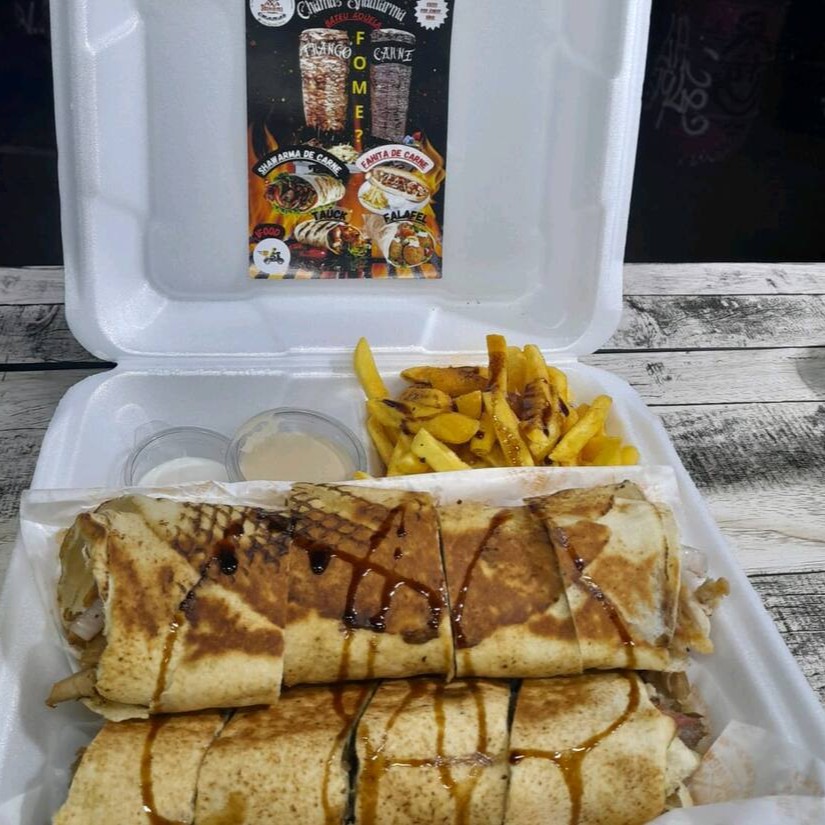 Um lanche Shawarma (kebabe ) de carne,um batata frita temperada e um refrigerante por apenas 50,00R$