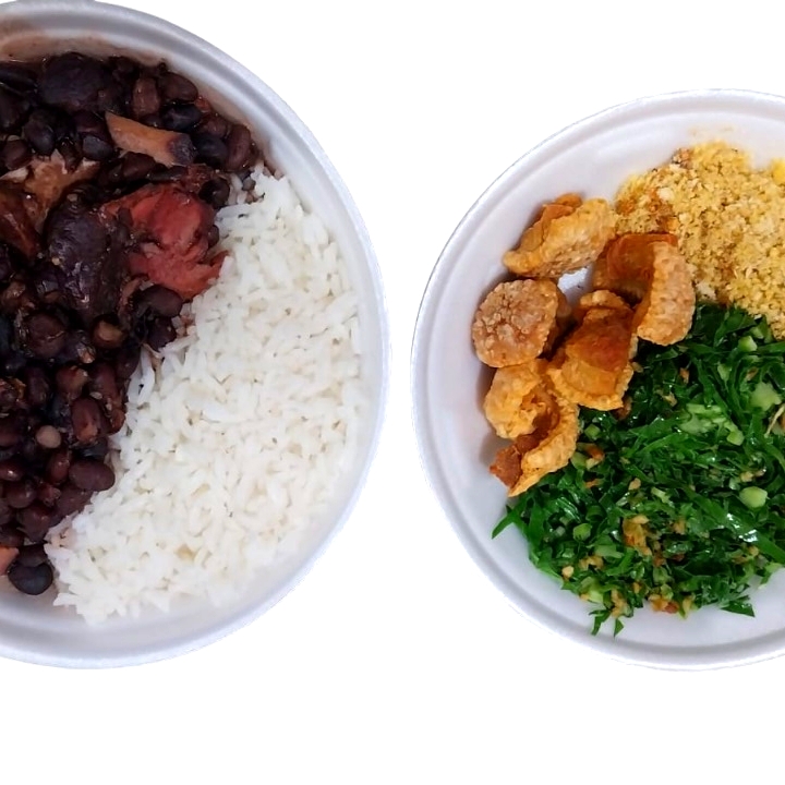 (Não fazemos feijoada magra) Arroz, feijão preto. pé, orelha, carne seca, lombo seco, calabresa, costelinha, farofa, torresmo, couve e vinagrete