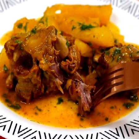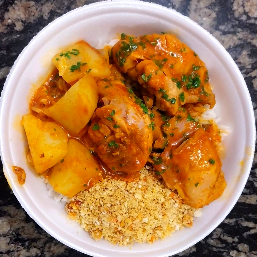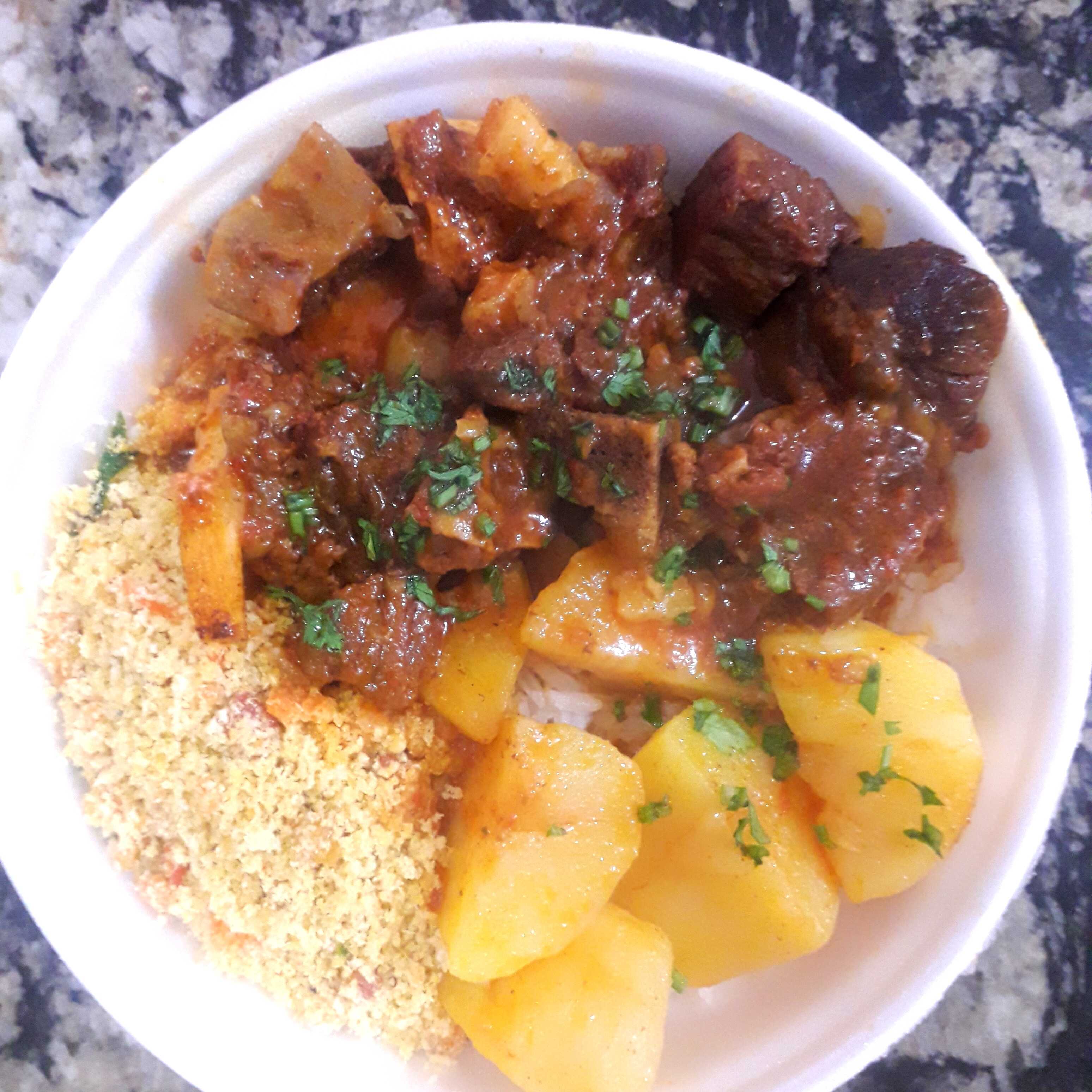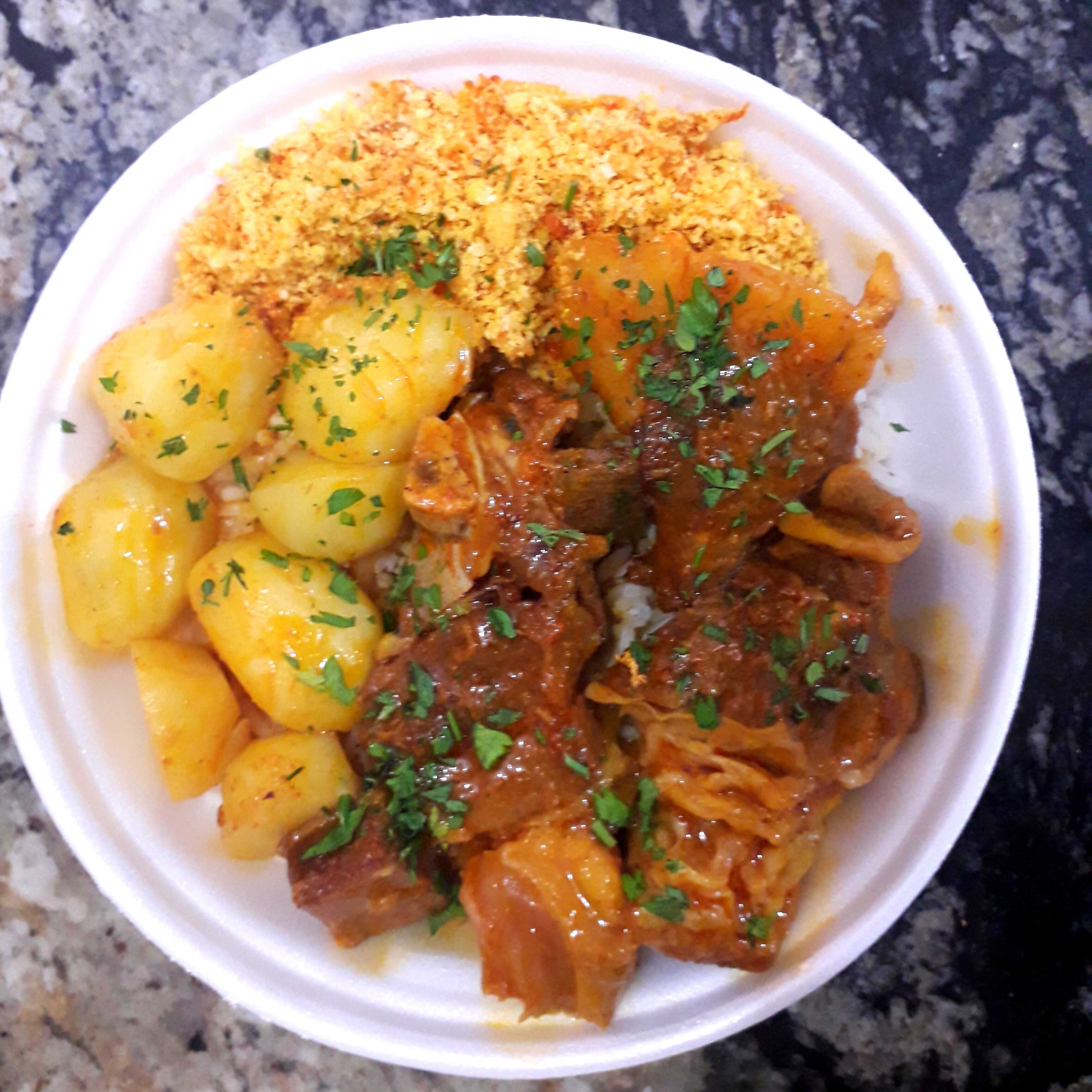 Arroz, feijão, farofa, rabada bovina ao molho com batatas cozidas