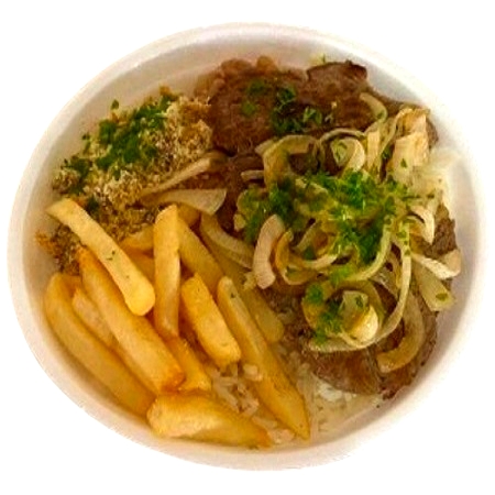 Arroz, feijão, fritas, farofa, e bife de contr-filé grelhado com cebola
