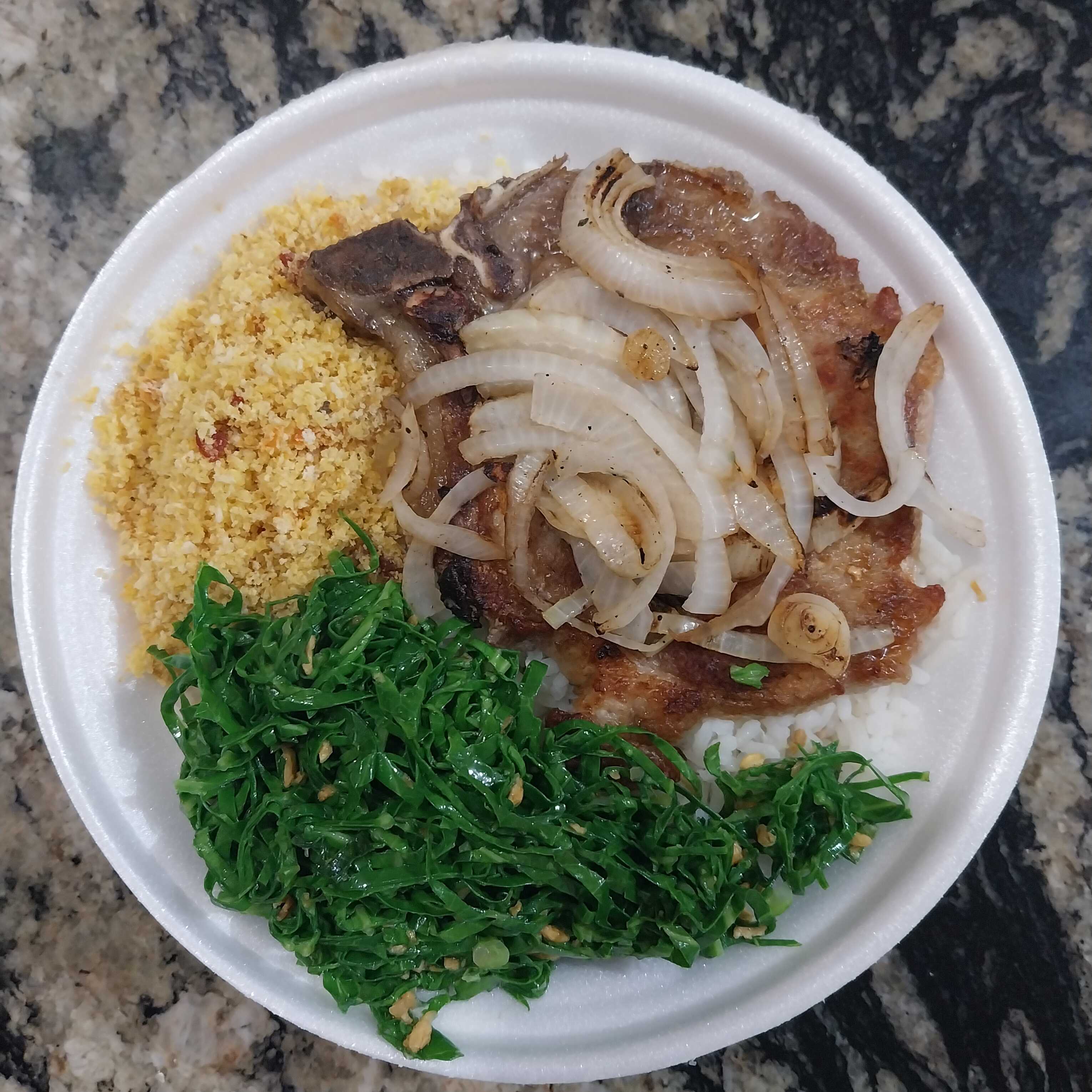 Arroz, feijão, farofa, couve refogada e bisteca grelhada acebolada
