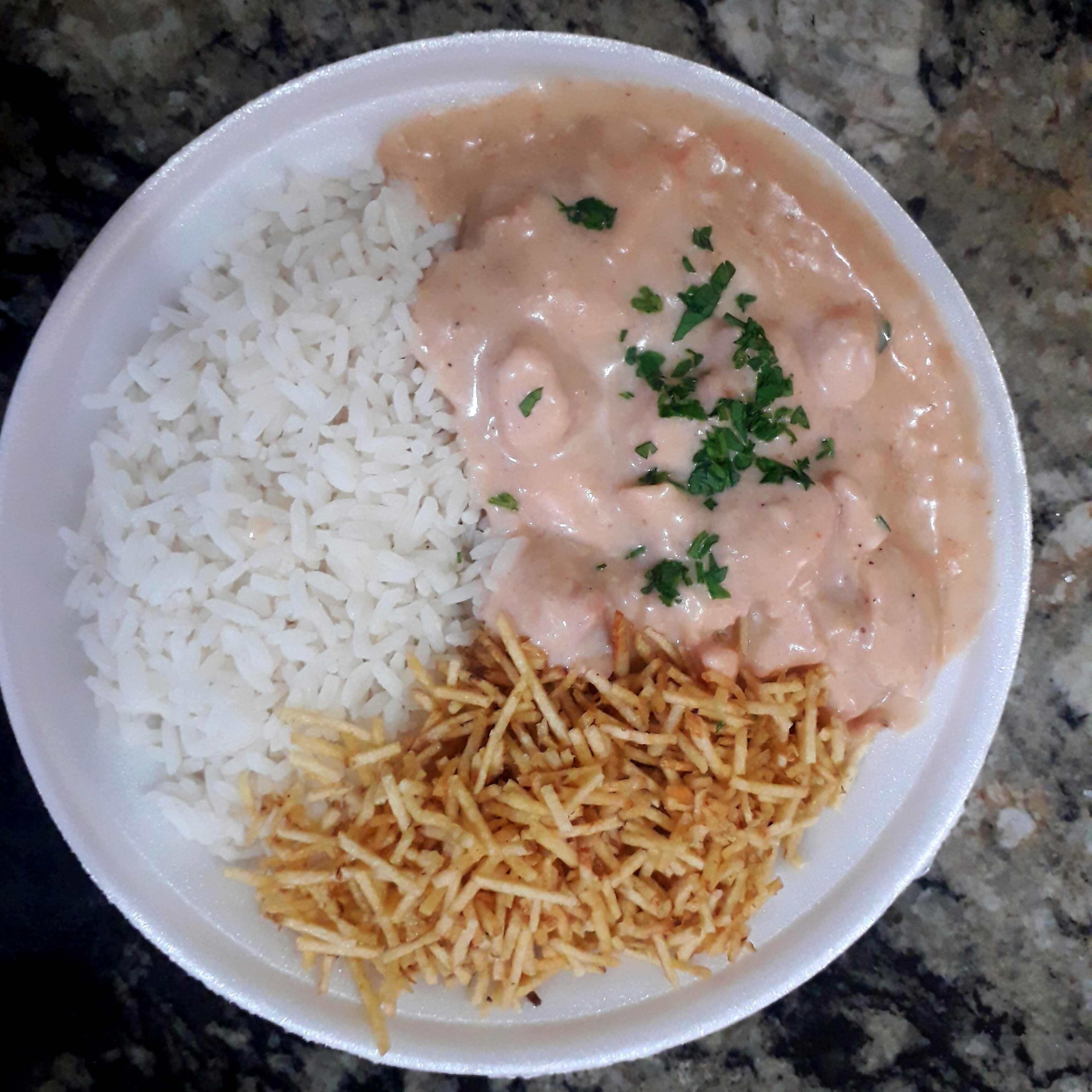 Arroz, feijão, farofa, batatas e carne de panela refogada