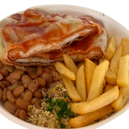 Arroz, feijão, fritas, farofa e filé de frango empanado, frito com queijo e molho de tomates frescos
