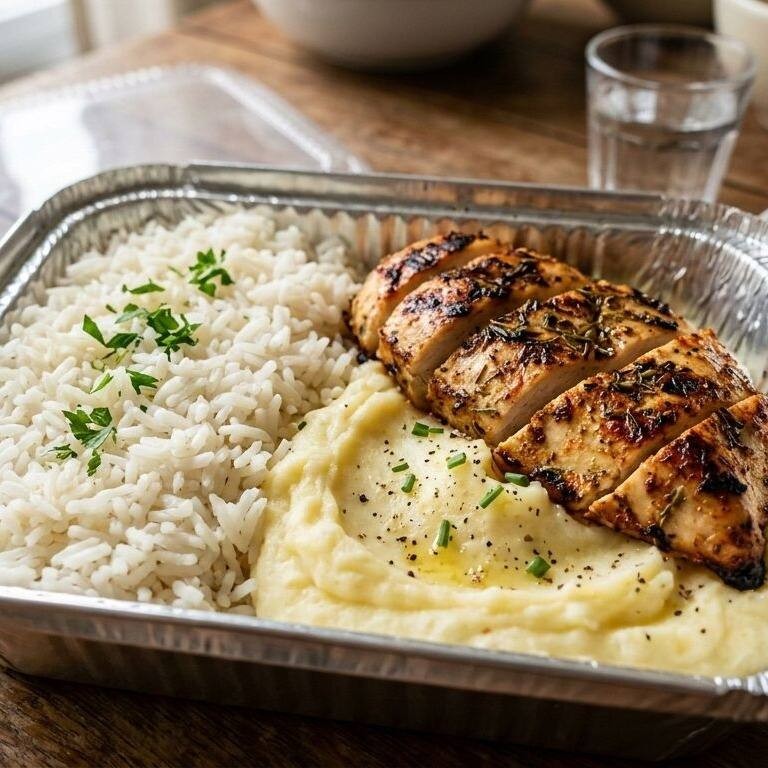 Uma marmitex de Filé de frango grelhado, acompanhada de arroz, feijão, batata frita e salada . Uma combinação que agrada a todos!