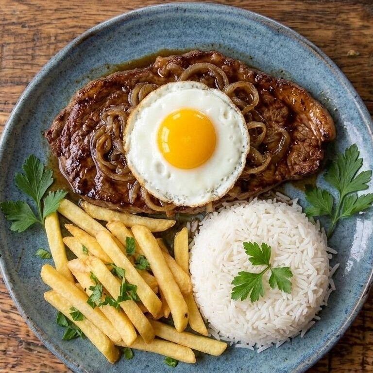 Uma combinação irresistível de arroz, feijão, bife acebolado e batata frita. Um clássico da comida caseira brasileira que vai te deixar satisfeito!