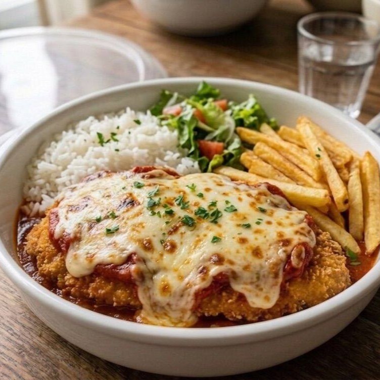 Uma marmitex de frango empanado ao molho de tomate e queijo, acompanhada de arroz, feijão e batata frita. Uma combinação que agrada a todos!