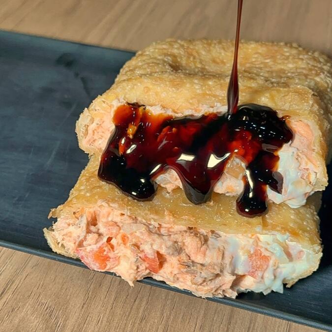 Salmão grelhado, cream cheese, Tomate e cebola. Um pastel leve, com recheio bem cremoso e absurdamente saboroso.