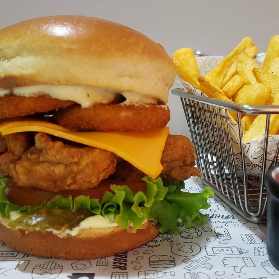 Delicioso pão brioche com nosso filezinho empanado, alface, tomate, picles, fatias de cheddar, anéis de cebola e uma saborosa maionese temperada!