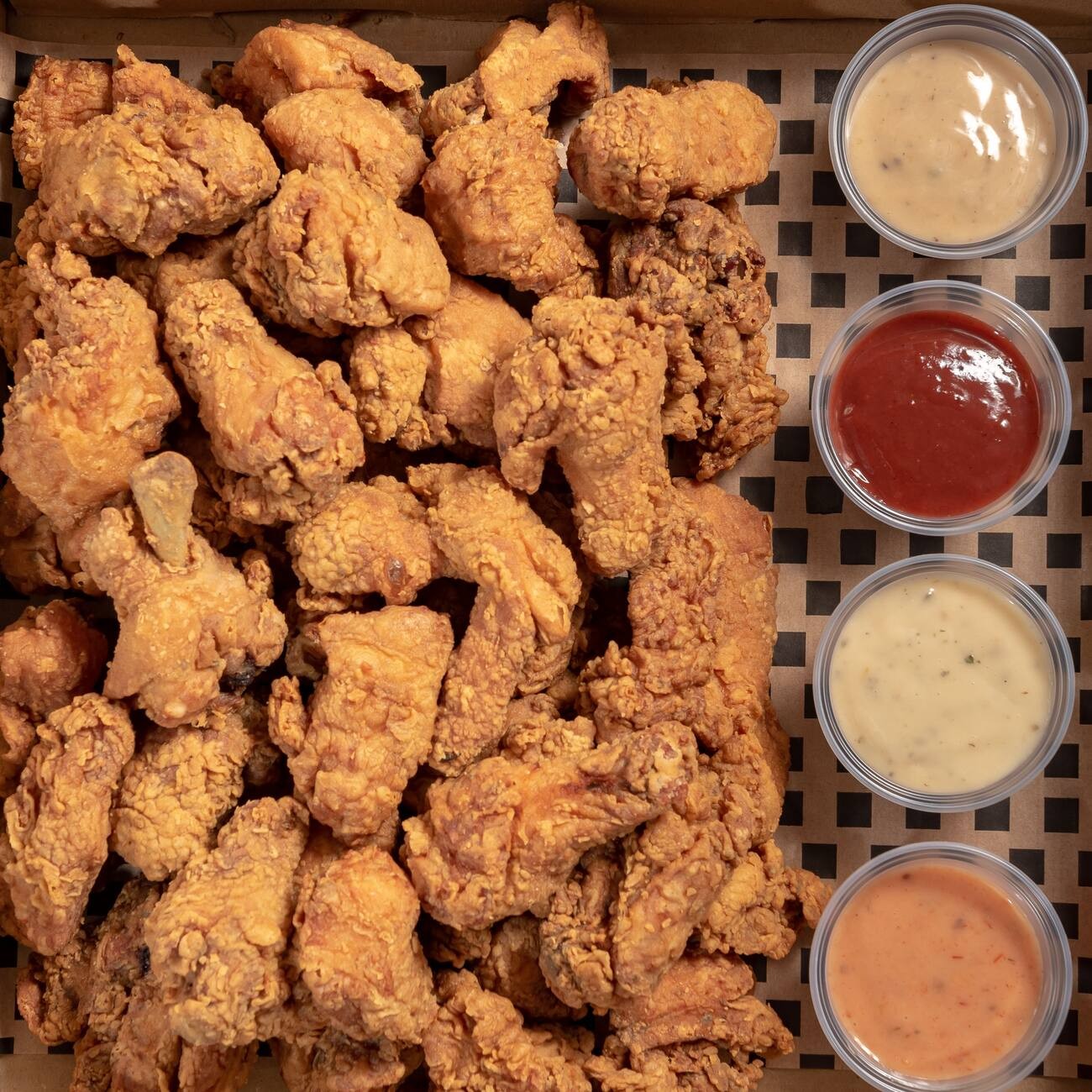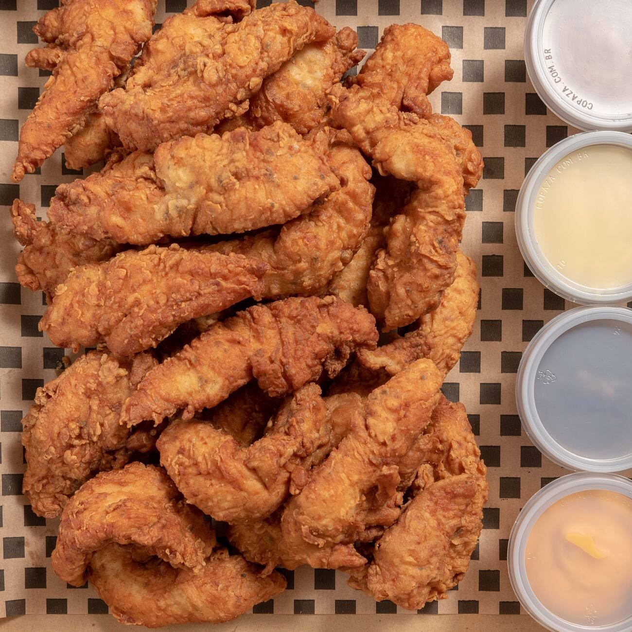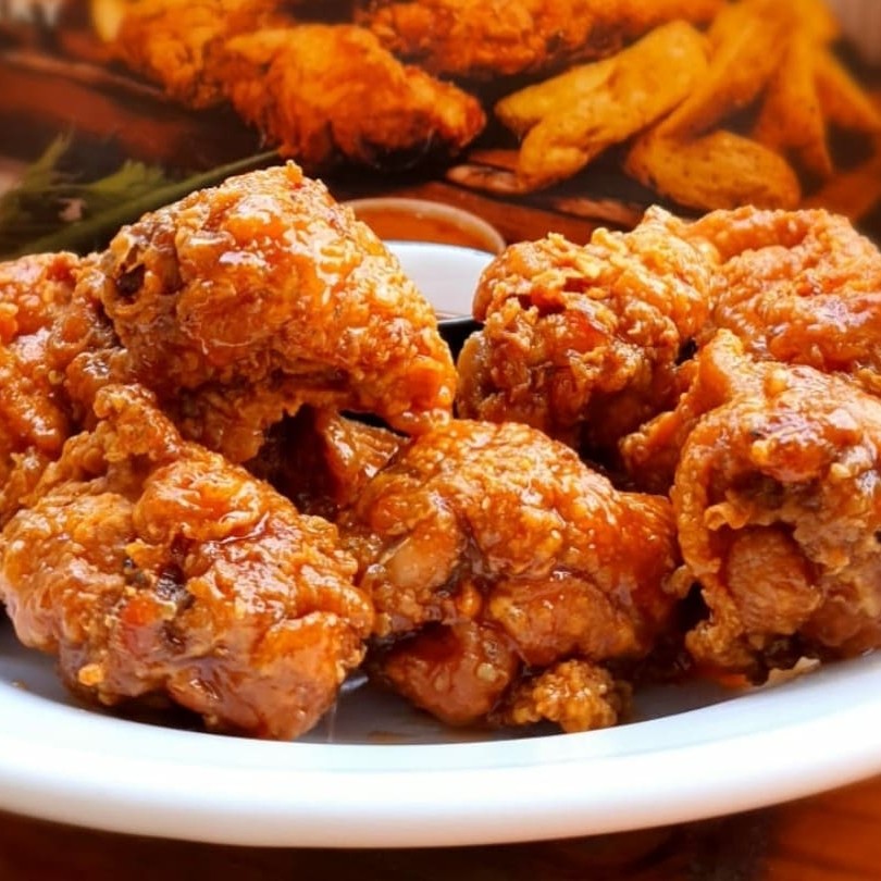 Coxinhas da asa, empanadas e fritas, envolvidas em nosso exclusivo molho Spicy Honey-Glazed Sauce. O Spicy Honey-Glazed Sauce é um molho exclusivo de autoria do Chicken Box, onde o mel e a pimenta se conectam em uma explosão de sabores. obs: frango pesado in natura