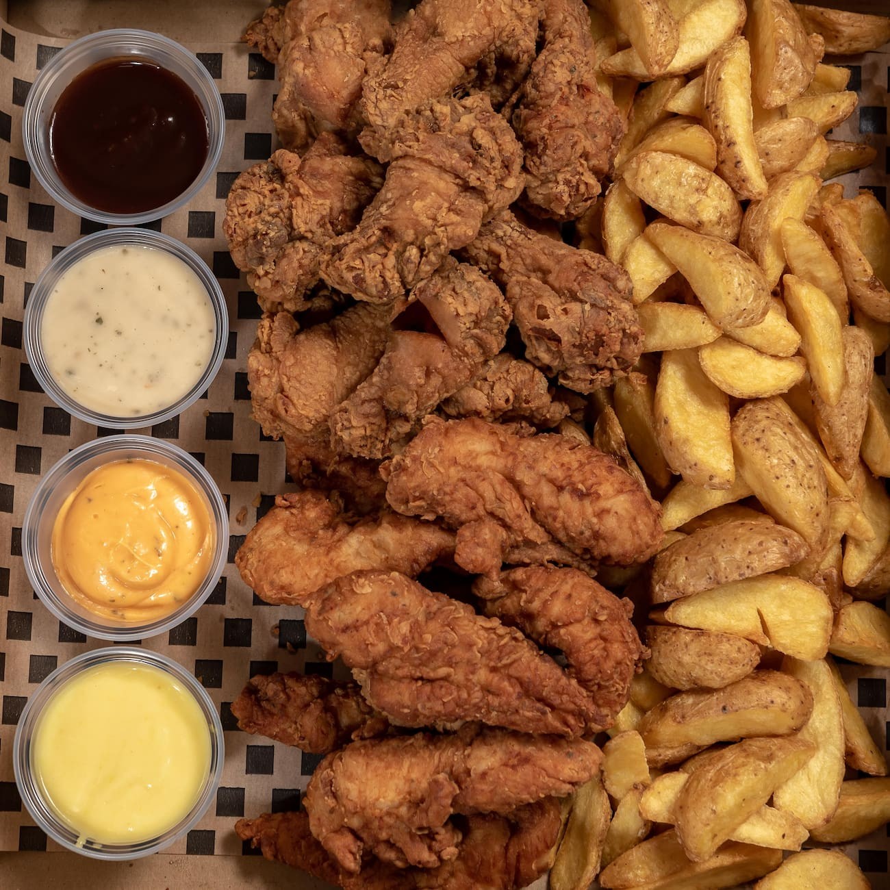 Frango Frito 2.250kg frango a passarinho (in natura)+ 4 molhos. Atenção: - frango pesado in natura (ou seja, antes do preparo) - não acompanha batata Obs: Todos os nossos cortes de frango são empanados com o exclusivo tempero Chicken Box
