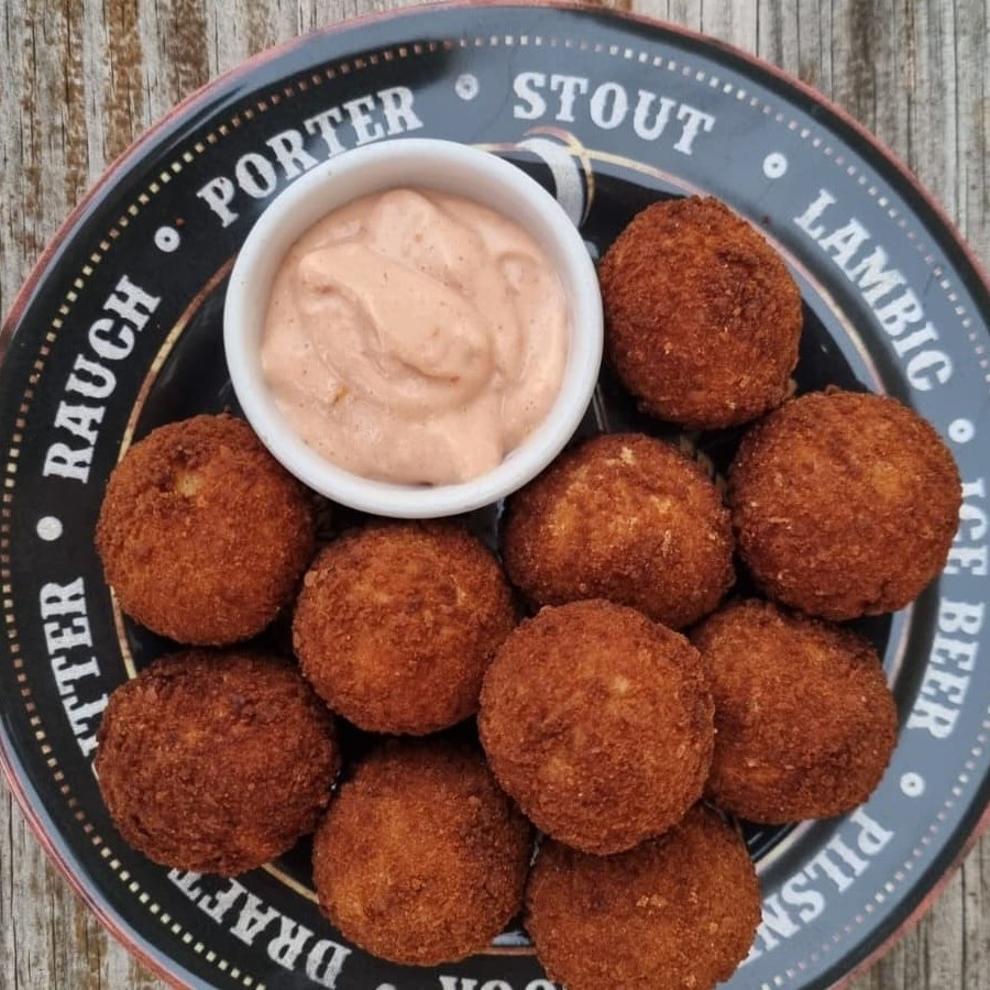 Crocante por fora e cremoso por dentro. Deliciosa porção com aprox. 10 bolinhos + 2 molhos a escolha . sugestão de molho : Picante