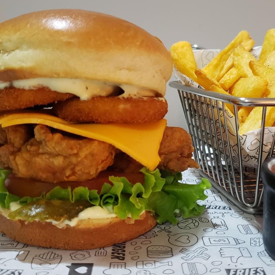 Delicioso pão brioche com nosso filezinho empanado, alface, tomate, picles, fatias de cheddar, anéis de cebola e uma saborosa maionese temperada!