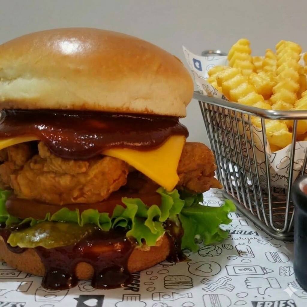 Pão brioche, filezinho empanado, molho barbecue, alface, tomate, picles e fatias de cheddar.