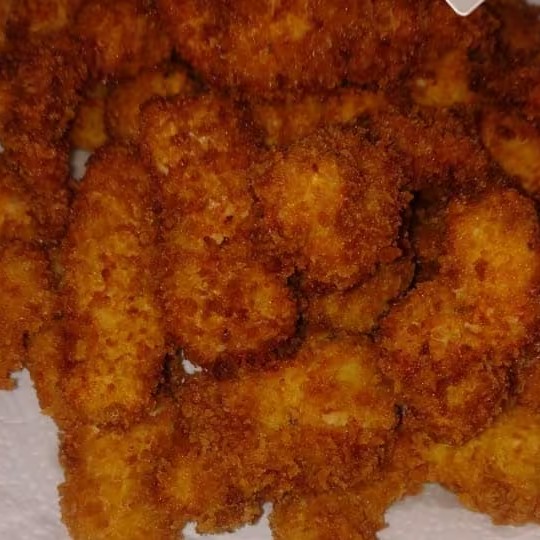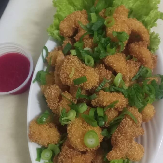 Camarao bem temperado depois empanados na farinha super crocante bem sequinho uma delicia coisa linda
