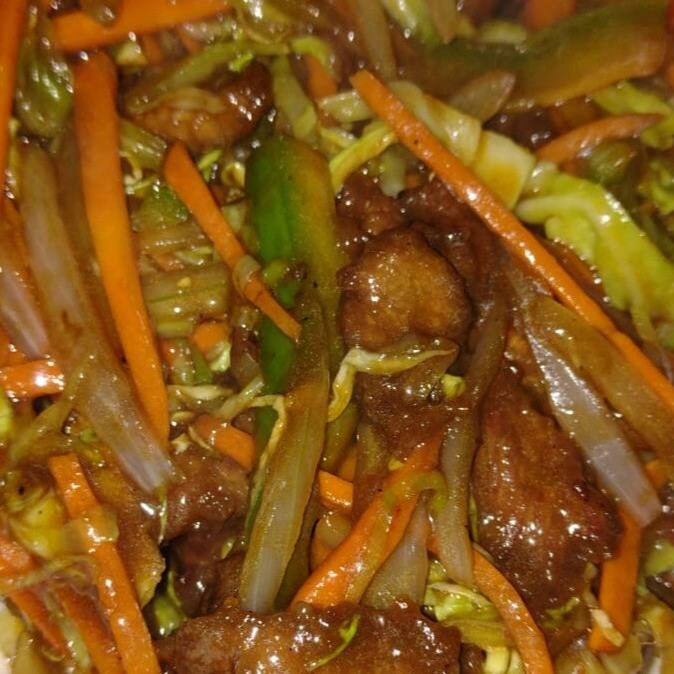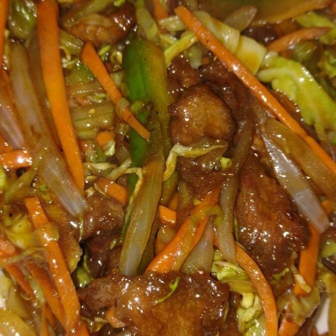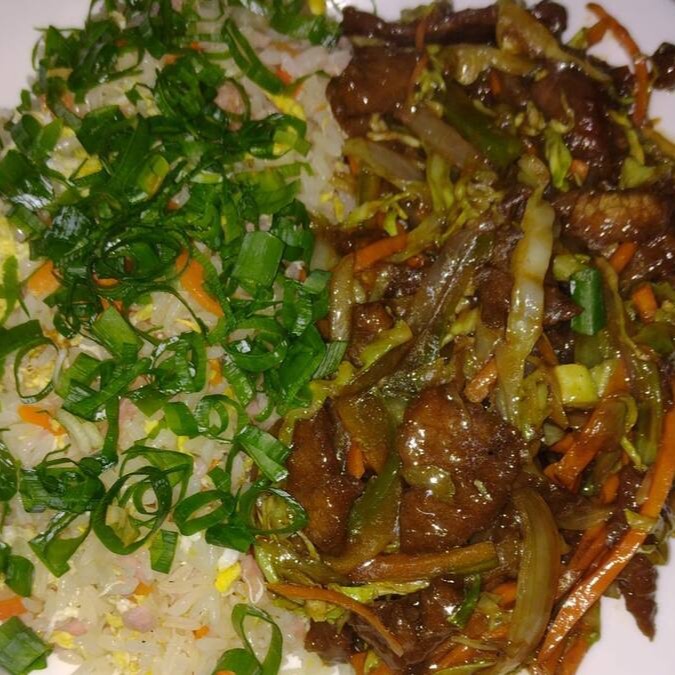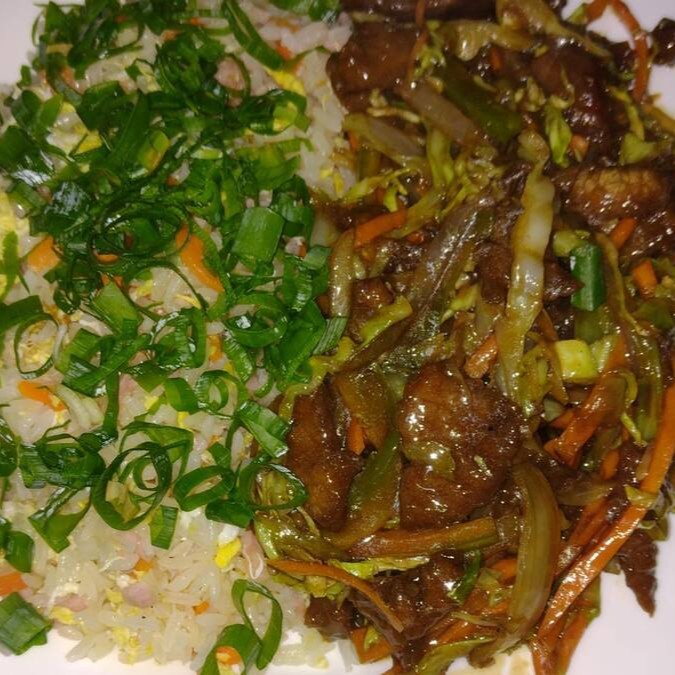 Carne chop suey ,acompanha,carne bovina,cenoura,desfiada,repolho,desfiado ,pimentao ,desfiano,na base do molho shoyu uma delicia e óleo de gergelin, 1/2 porçao de yakimeshi,vai ovo,cubinhosde cenoura,presunto,cebolinha picada, coisa linda