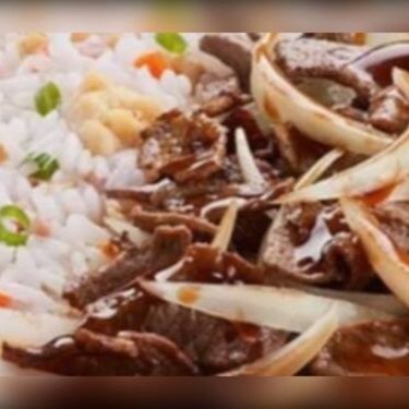 Carne com cebola ,carne bovina ,cebolas em tirinhas ,na base de shoyo td bem temperado umas delicia coisa linda. Com arroz ,temperado com ovo,cenouras,presuntos ecebolinhas
