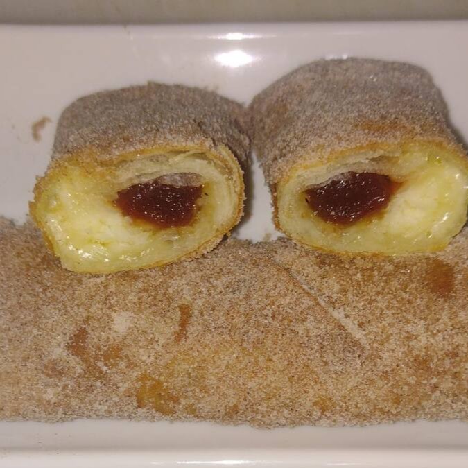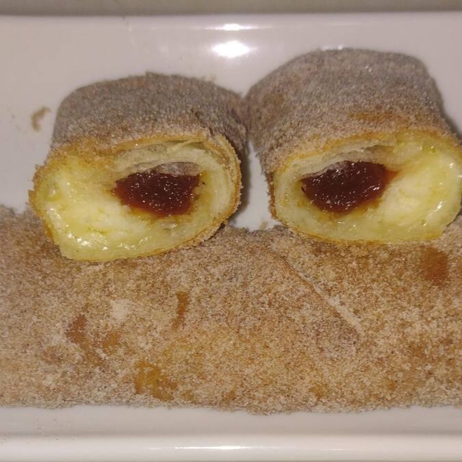 Rolinho julieta e romeu com goiabada e queijo mussarela frito bem sequinho uma delicia ,leve mente com açucar e canela depois de frito