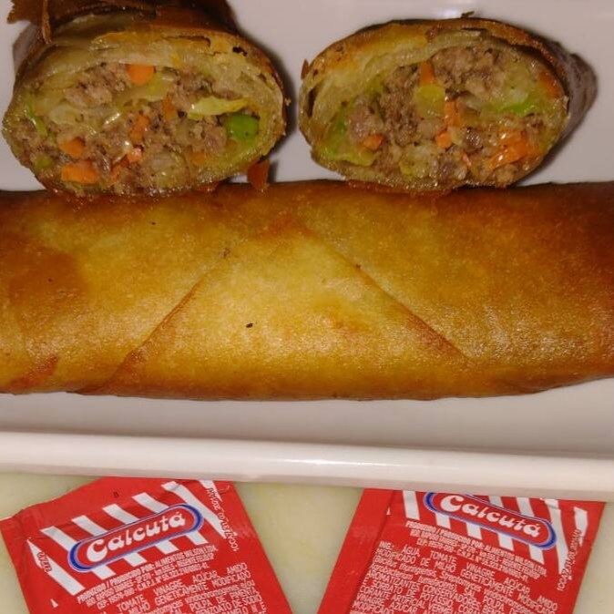 Rolinho na massa recheada com carne moida, repolho desfiadoe cenoura frito bem sequinho uma delicia