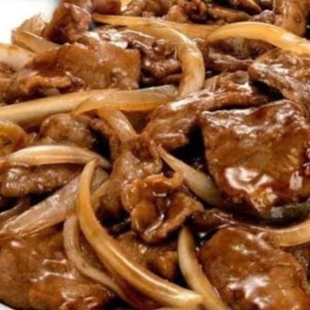 Carne com cebola ,carne bovina ,cebolas em tirinhas ,na base de shoyo td bem temperado umas delicia coisa linda