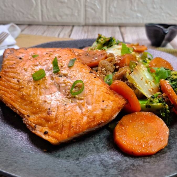 Salmão Grelhado e legumes grelhado na manteiga.