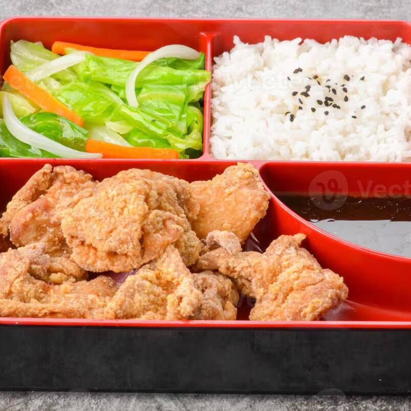 Bento Karaage crocante por fora e suculento por dentro Acompanha Gohan, Porção Karaage, 01 harumaki legumes , 01 harumaki de queijo e sunomo. Imagem meramente ilustrativa
