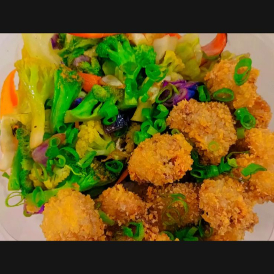 Domburi crispy chicken Arroz primavera, legumes na manteiga ( brócolis, couve flor, cenoura e repolho ), cubos de frango frito empanado na panko e cebolinha. Porção de aproximadamente 450 Gramas Imagem meramente ilustrativa