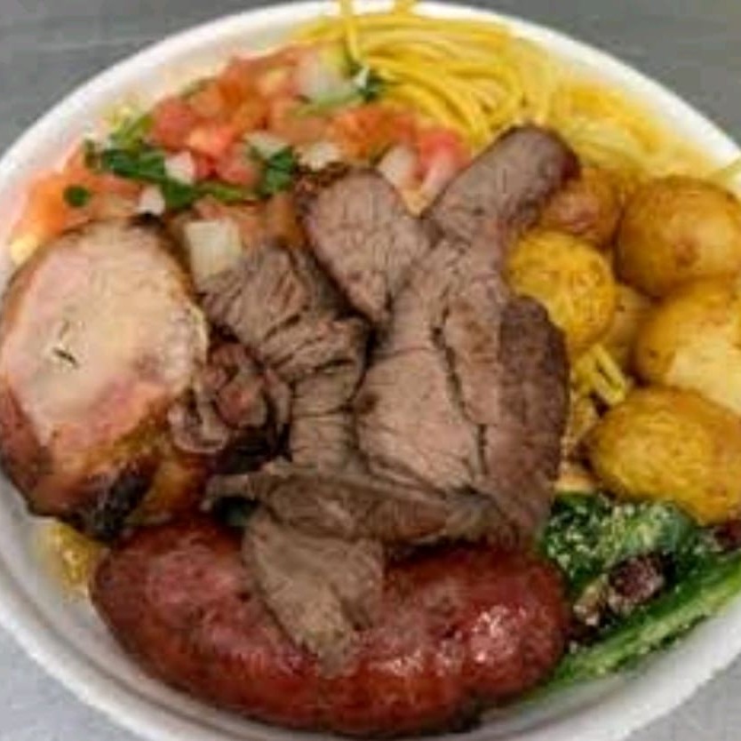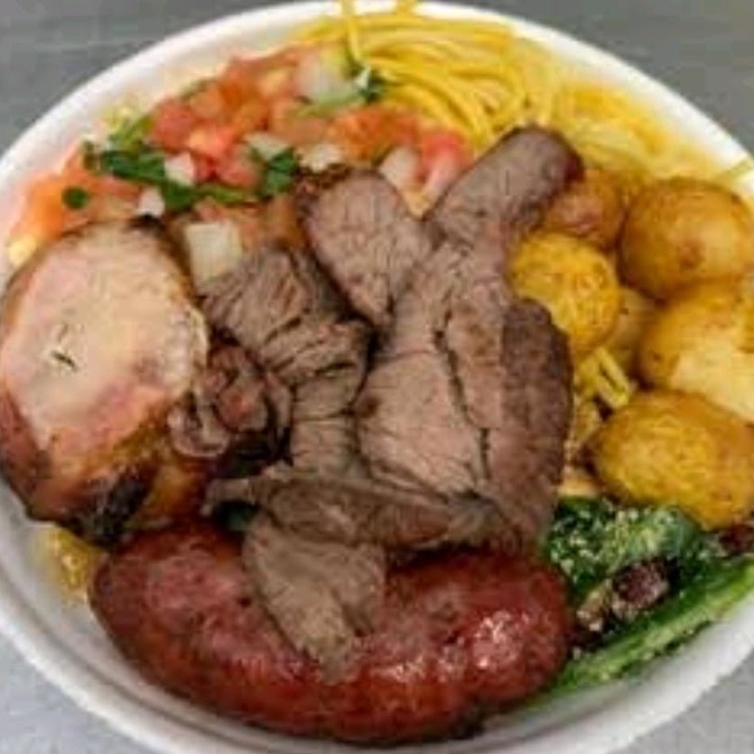 Arroz, Feijão, Fritura do Dia e farofa + 1 kg de churrasco misto ( carne fraudinha, frango, linguiça e lombo) e salada de alface tomate e cebola