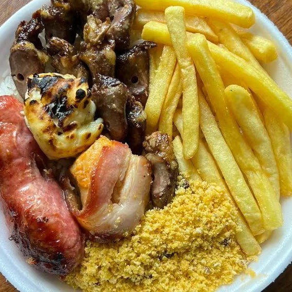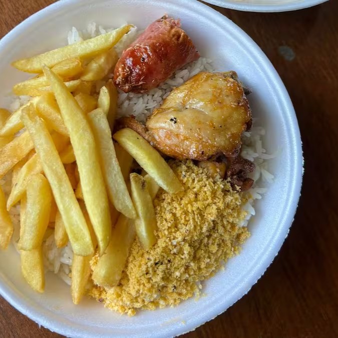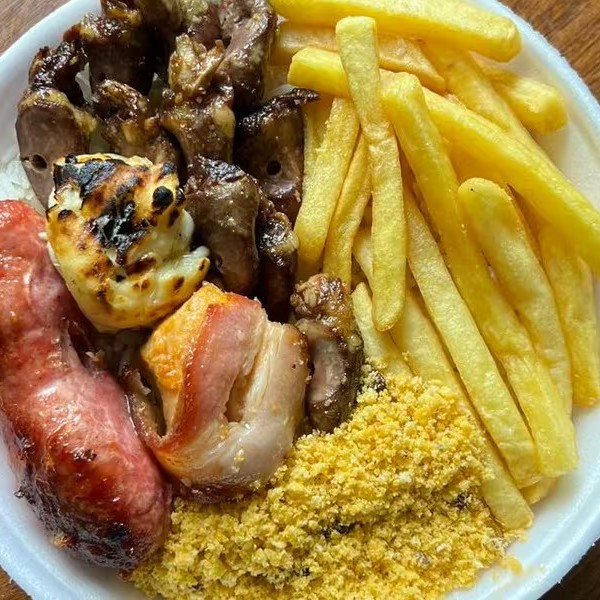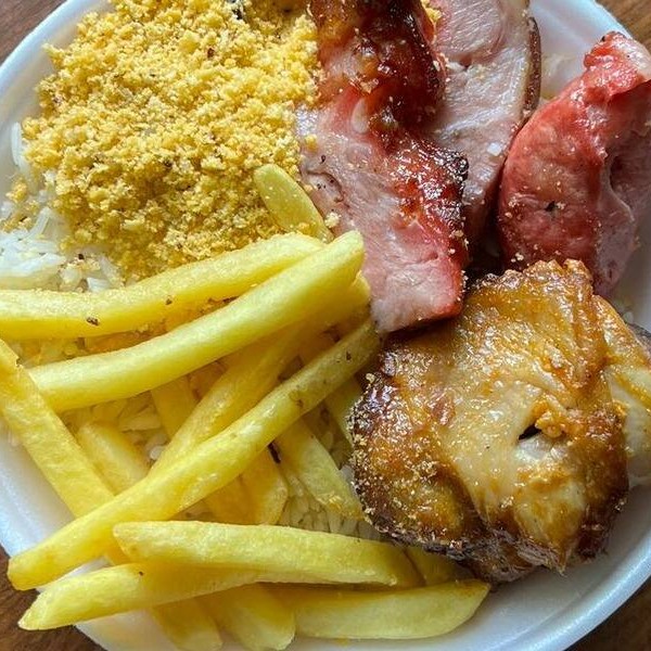 Acompanha arroz , feijao , farofa , batata frita medalhao de frango tender e linguiça