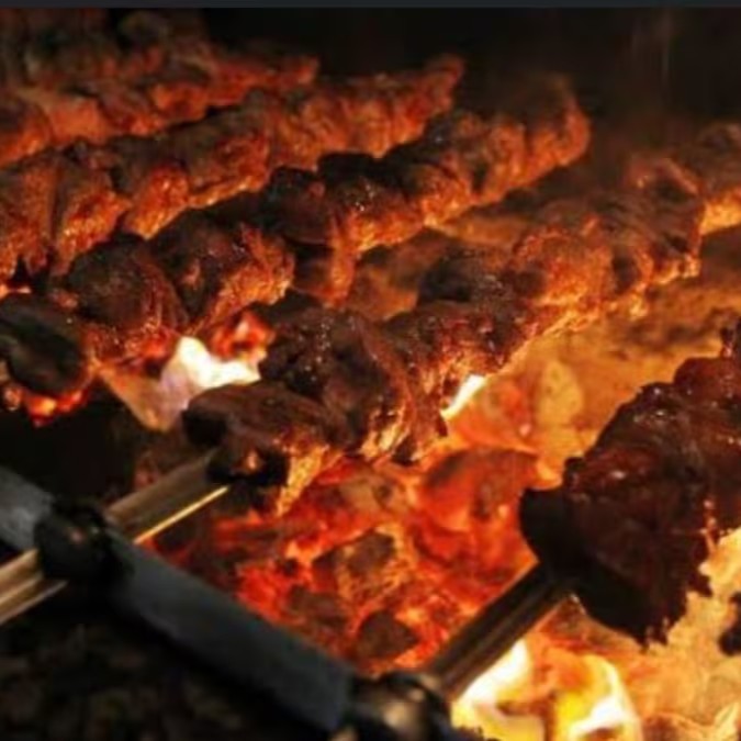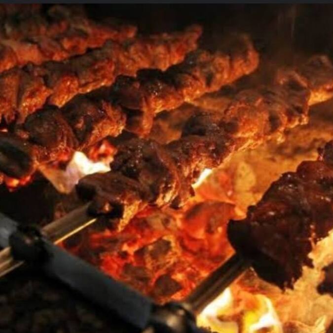 Carne assada mista linguiça , medalhão de frango , tender , coração , cupim , fraldinha , maminha , alcatra