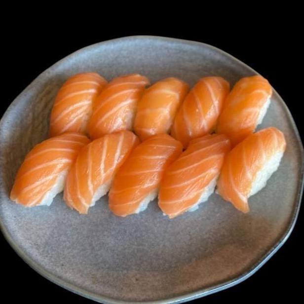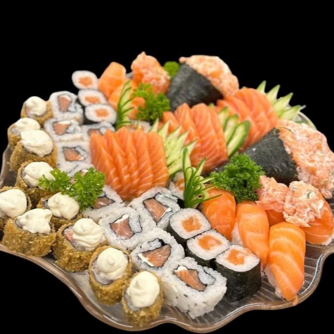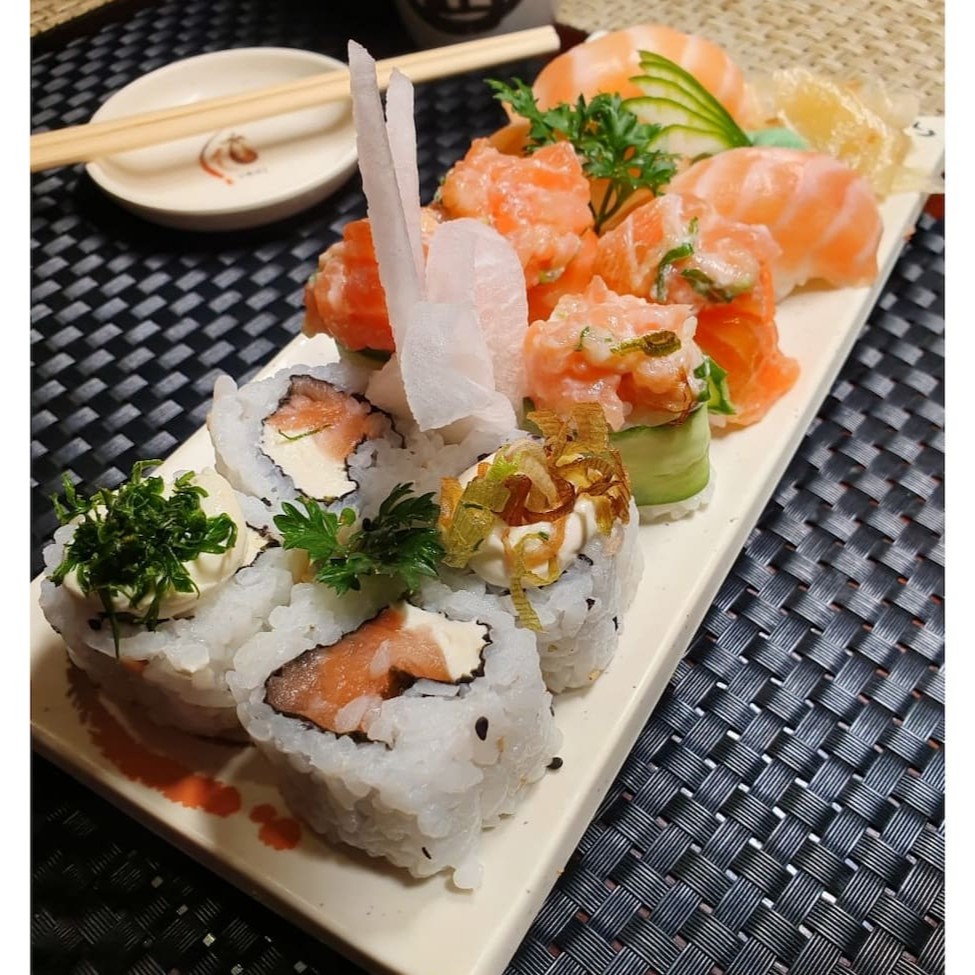 10 sashimis de salmão,8 hossomaki, 4 uramaki de salmão, 4 niguiri de salmao, 10 hot roll.