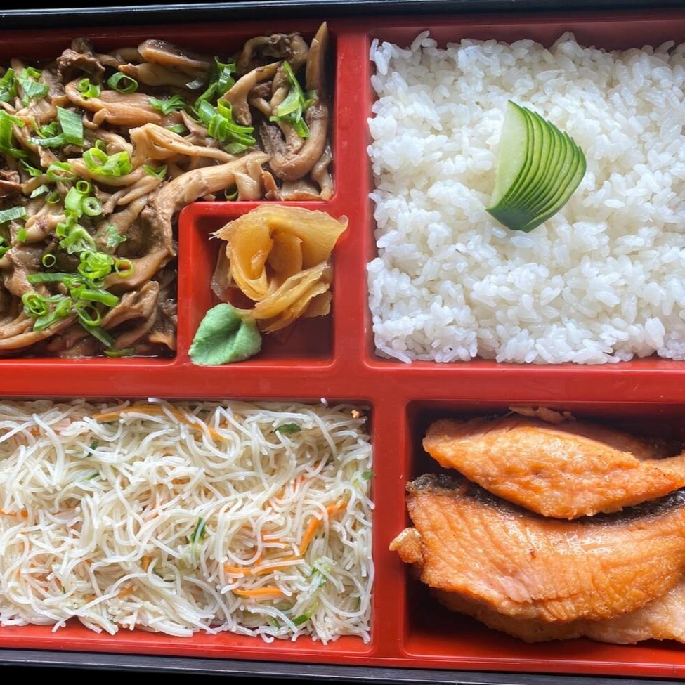 Salada de bifum, shimeji, gohan e salmão grelhado