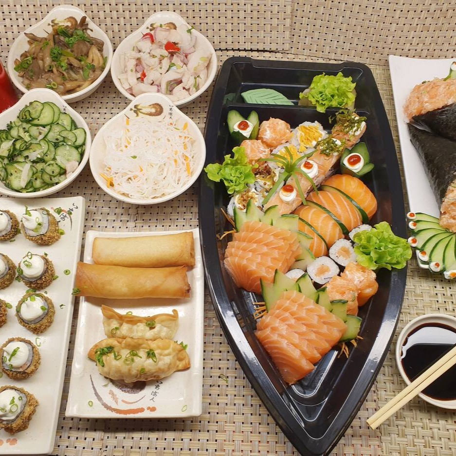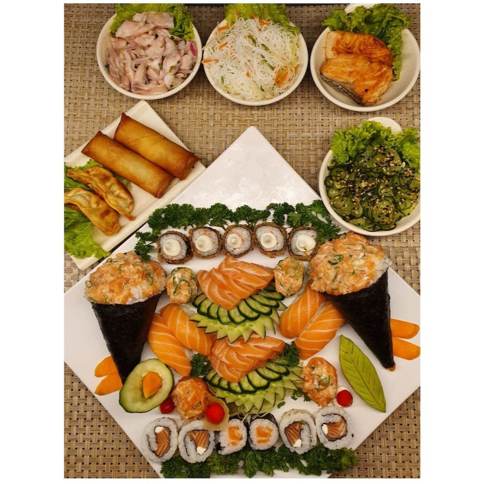 1 sunomono,1 ceviche,, 1 shimeji, 1 biffum,2 salmão grelhado 2 rolinho primavera , 2 guioza, 4 uramaki, 2 hossomaki, 2 luizinho de salmao, 2 luizinho de pepino, 4 niguiri, 8 sashimi de salmão, 5 hot roll, 2 temakis