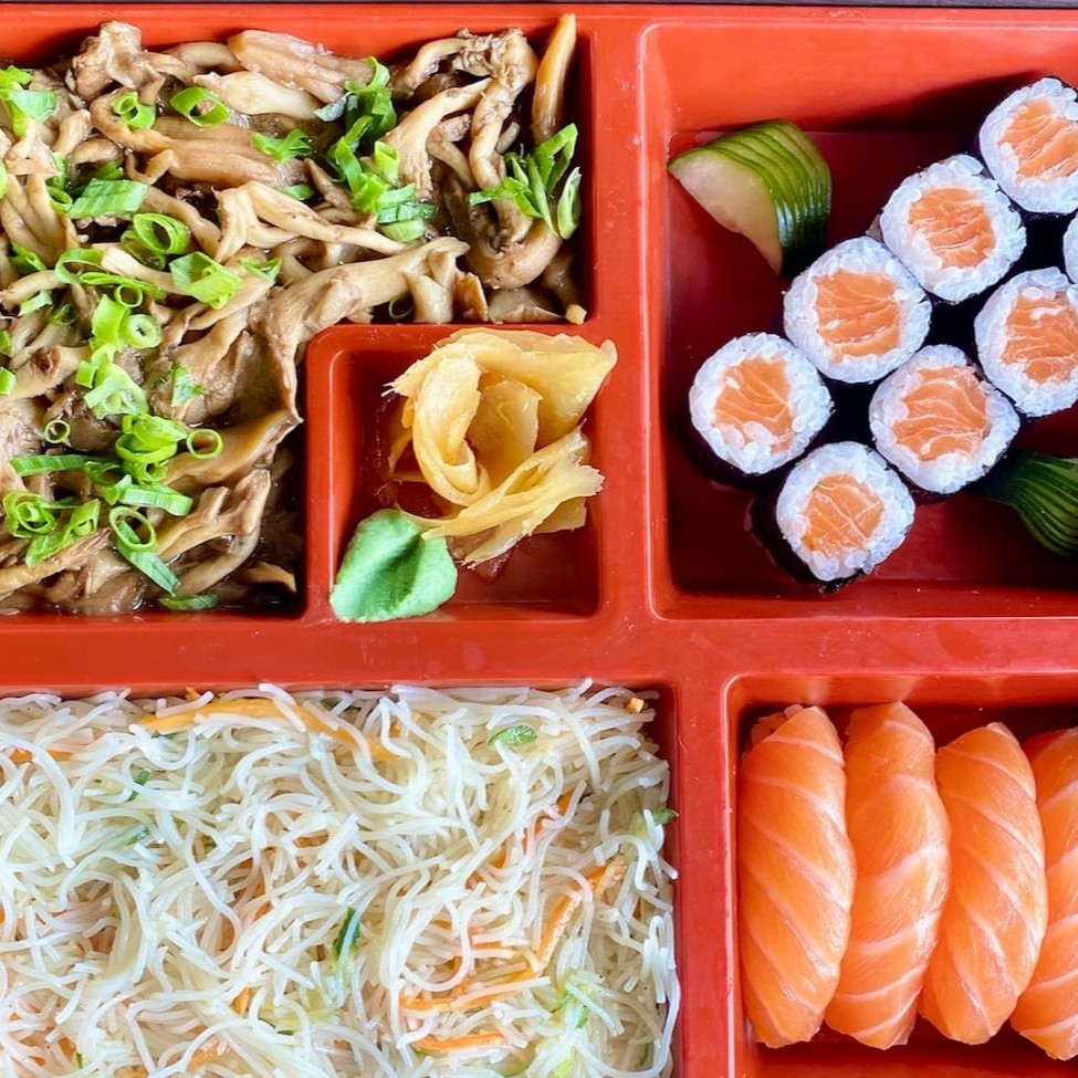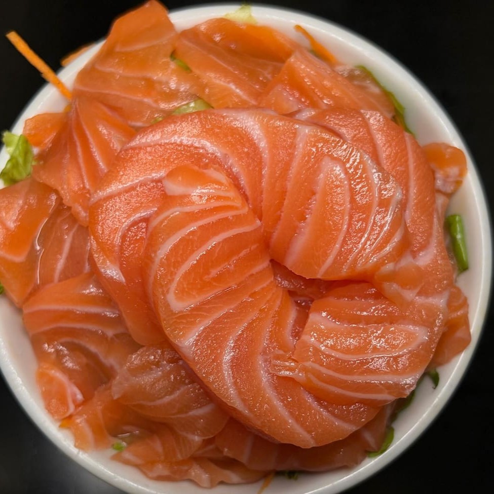 7 fatias de sashimis de salmão, salada de bifum, shimeji e gohan