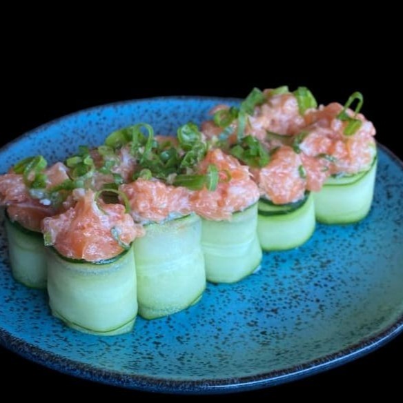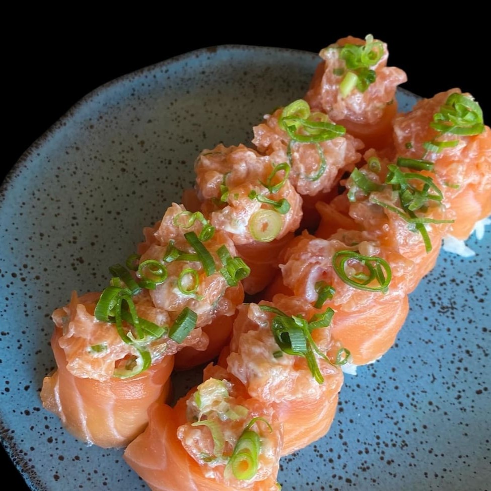 1 temaki - salmão e cebolinha sem arroz. 3 sashimis de salmão. 3 sashimis de salmão maçaricado com geleia de pimenta 3 joe de salmão sem arroz. 3 joe de salmão com couve crispy. 3 sakezushi flambado e finalizado com gergelim e raspa de limão.