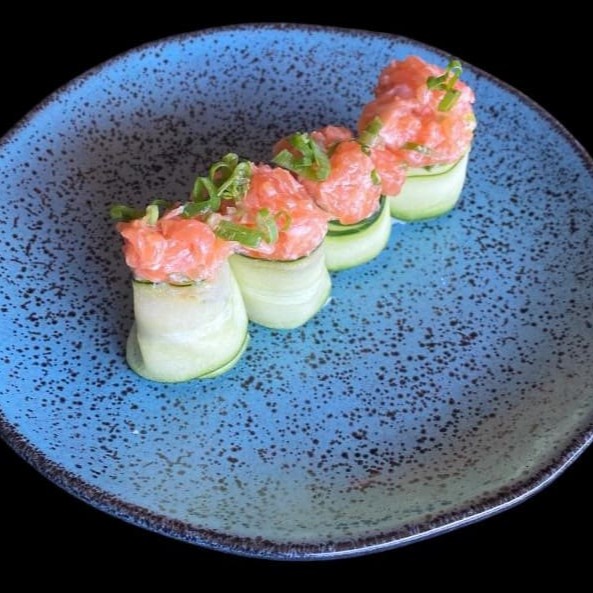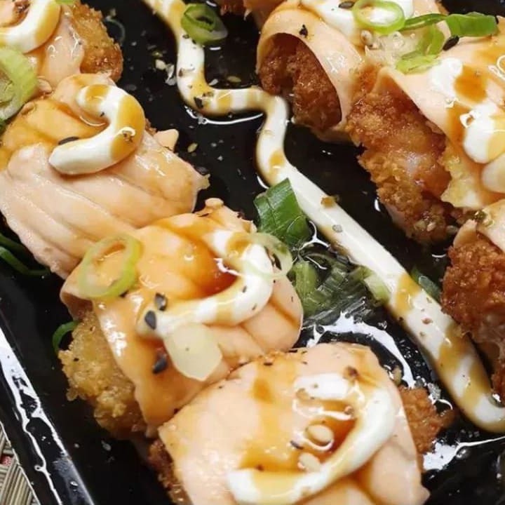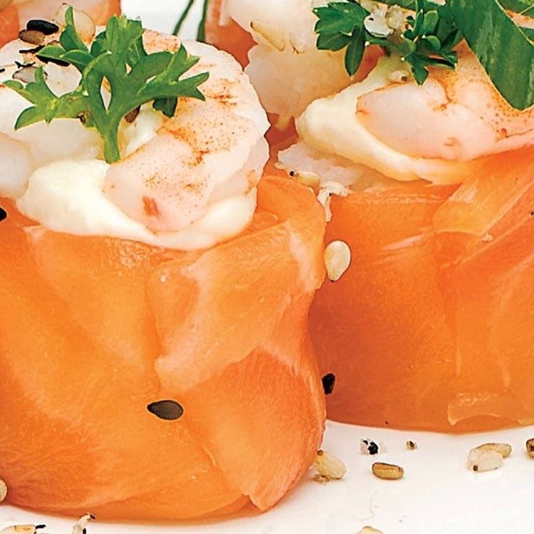 Camarão enrolado com salmão, Catupiry, azeite, tarê e temperos do cheff