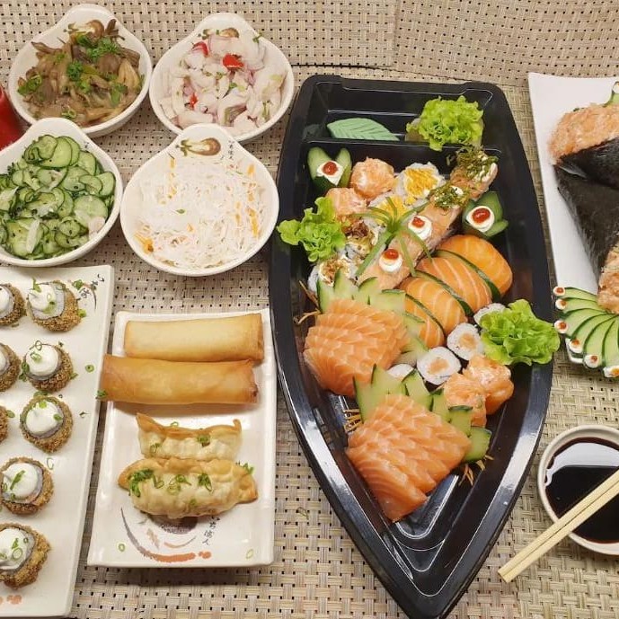 1 porção de shimeji 1 porção de bifun 1 porção de sunomono 1 porçaõ de ceviche 2 temaki salmão 2 guiozas 2 harumakis 10 sashimi salmão 8 uramakis 4 niguiris 4 hossomakis 4 jyos 10 hot rolls 4 sushi goiabada