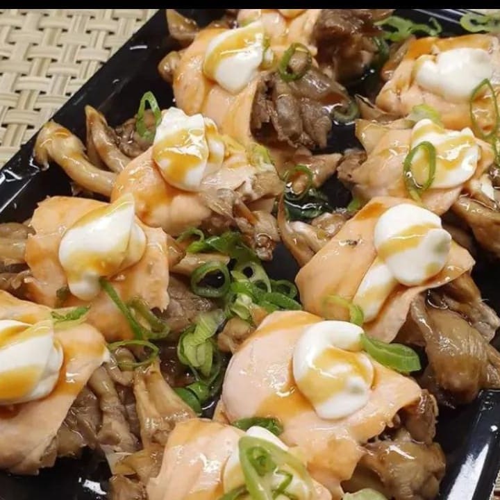 Shimeji enrolado com salmão, e tarê