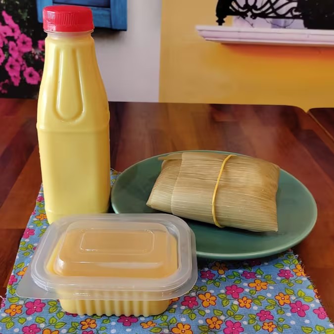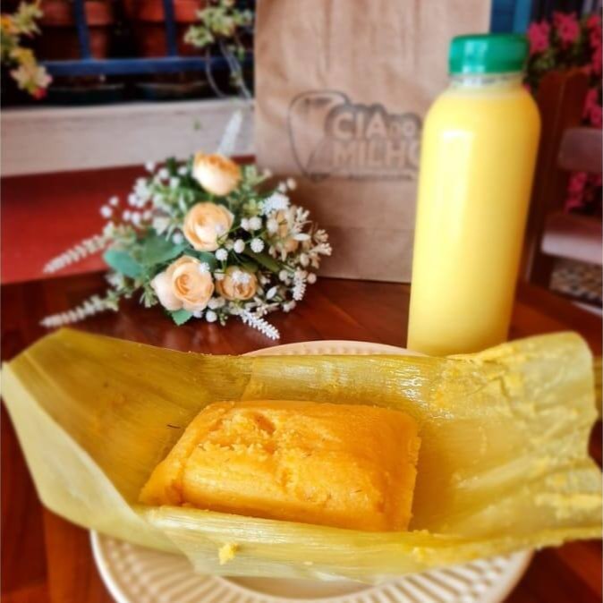 Uma pamonha (sabor a escolha), suco de 500ml, um curau de 200g
