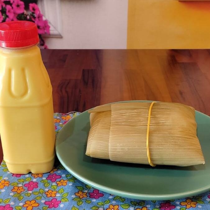 Deliciosa pamonha sabor a sua escolha e um delicioso suco de milho