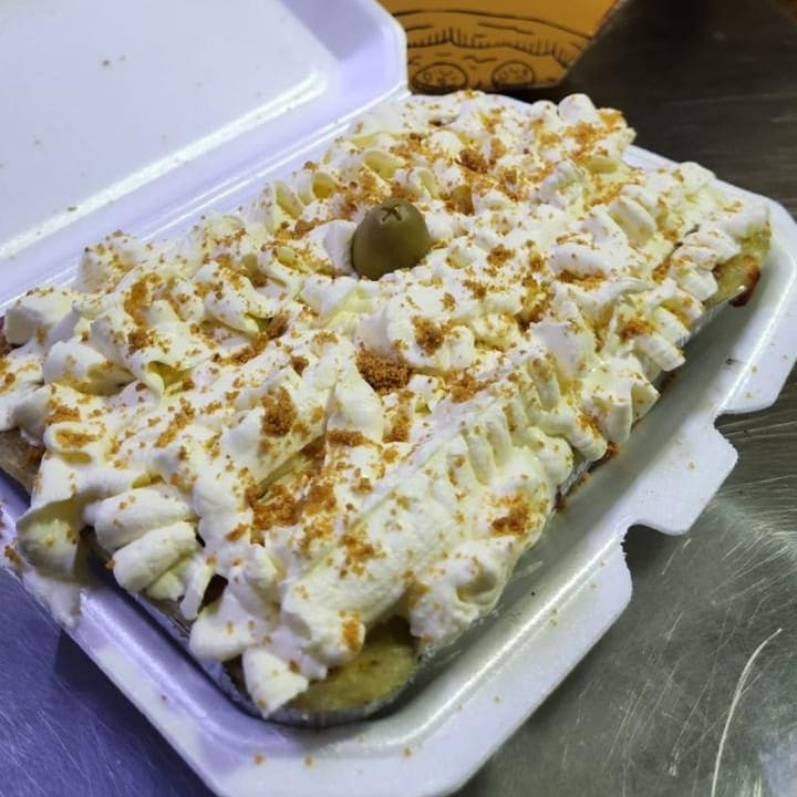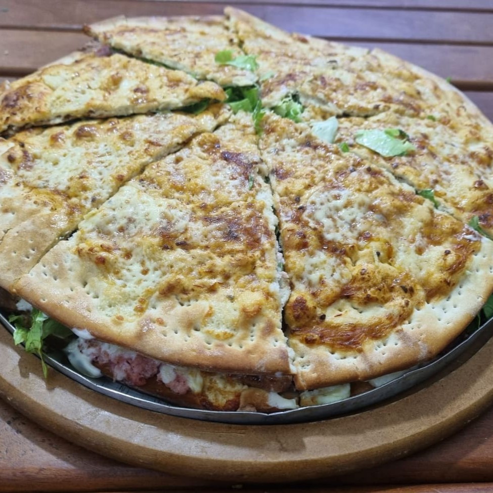 Nova modalidade de pizza entrando no nosso cardápio... A Pizza em formato de hambúrguer. Ela é composta por: Massa artesanal de pizza, molho de tomate, mussarela, requeijão cremoso Tirolez, fatias de bacon defumado, presunto ralado, fatias de calabresa, milho, hambúrgueres de 120g, batata palha, alface e tomate. À média pode servir até oito pessoas e à brotinho pode servir até quatro pessoas.