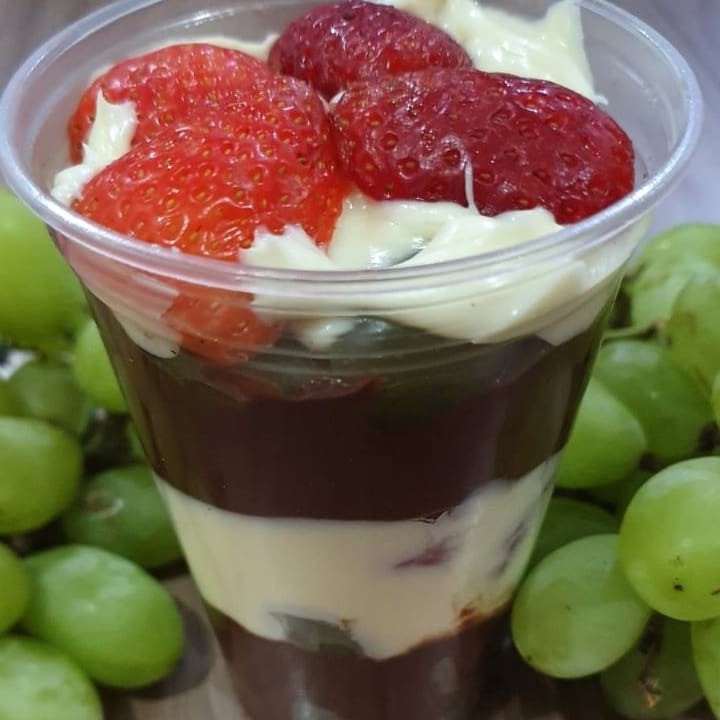 Copinho com camadas de Nutella Original, recheio de leitinho, morangos e uvas thompson.