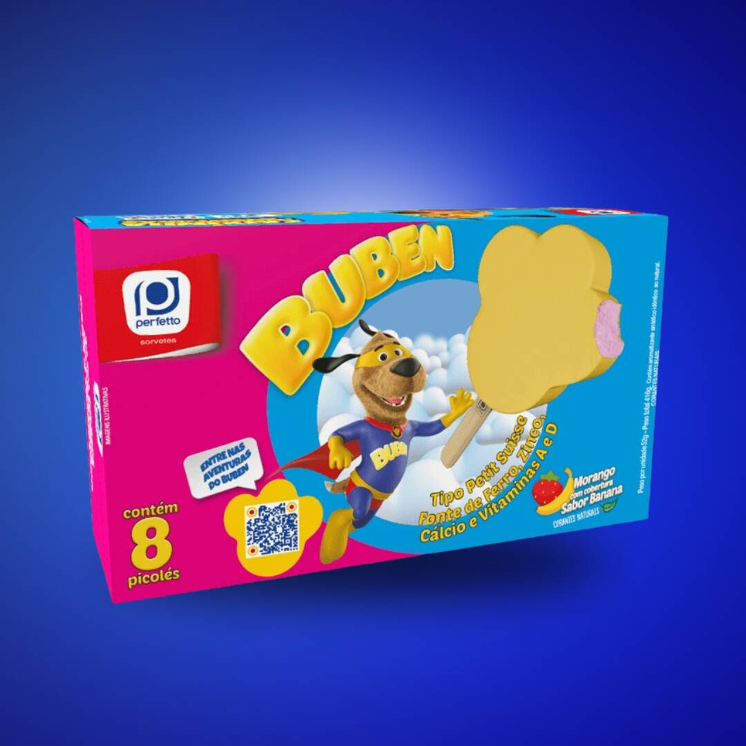O picolé Buben da Perfetto é a combinação perfeita de sabor e diversão para os pequenos! Feito com cremoso sorvete de morango tipo queijo Petit Suisse e uma cobertura especial sabor banana, ele traz um toque irresistível a cada mordida.