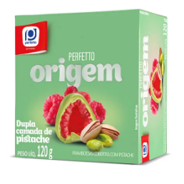 Em cada caixinha, suculentas Framboesas com dupla camada, a primeira com uma pasta de pistache, feita do fruto seco, coberta por uma camada especial de chocolate branco.